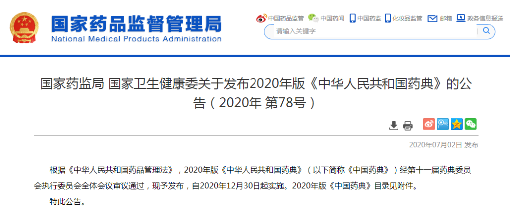 7月2日,國(guó)家藥品監(jiān)督管理局、國(guó)家衛(wèi)生健康委發(fā)布公告,正式頒布2020年版《中華人民共和國(guó)藥典》(以下簡(jiǎn)稱《中國(guó)藥典》)。新版《中國(guó)藥典》將于今年12月30日起正式實(shí)施。